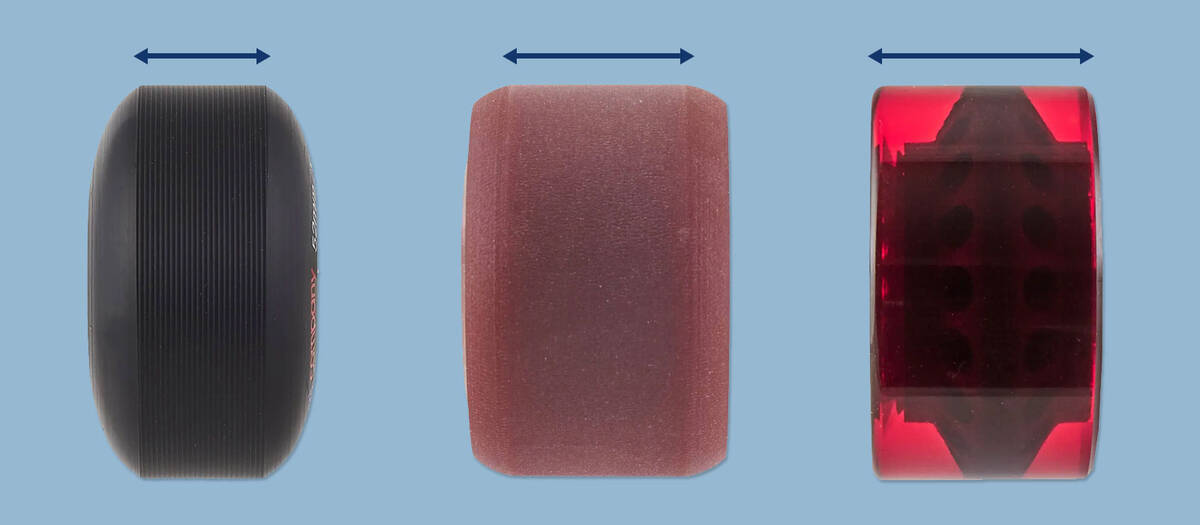 Более узкое пятно контакта увеличивает отзывчивость, снижает трение и повышает восприимчивость к скольжению (лучше для тупых слайдов!). При использовании узких колес скейтборда ваш вес концентрируется на меньшей поверхности, что делает вибрации от неровностей более ощутимыми. Кроме того, узкие колеса скейтборда легче, так как имеют меньше материала на боковинах.